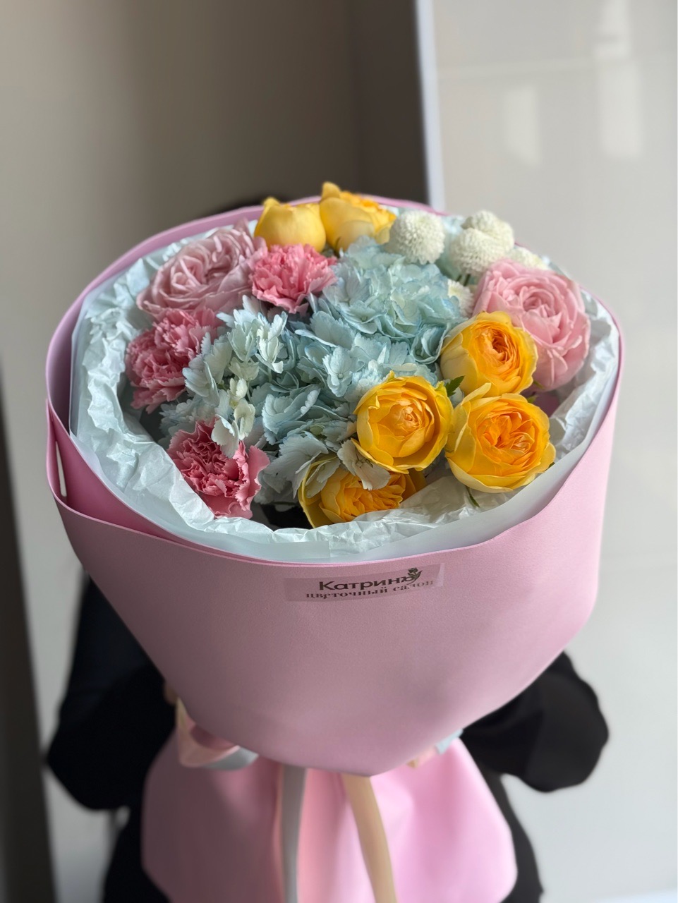 В составе: розы, гортензия, диантусы, хризантемы. Букет выглядит объемно и дорого, отлично подойдет как современный подарок.