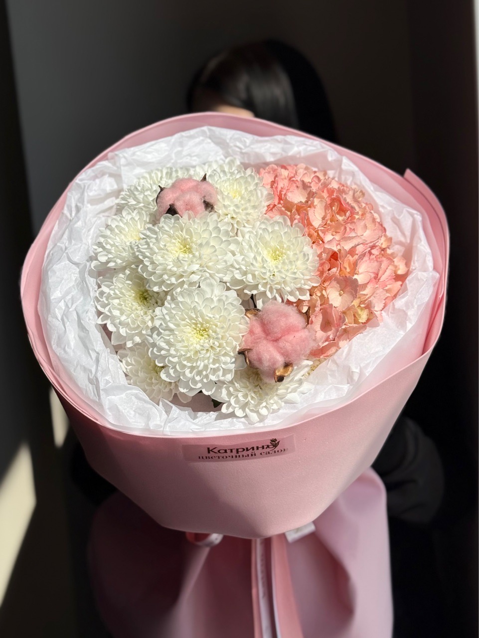 Нежный и уютный букет с гортензией, хлопком и диантусами. Легкий «инстаграмный» стиль с мягкой текстурой.