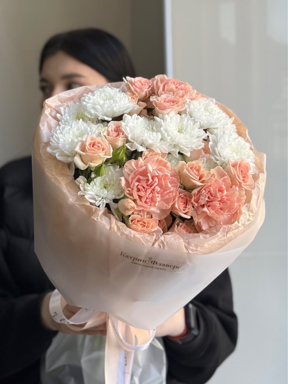 В составе: кустовые розы, хризантемы, декоративная зелень. Букет выглядит аккуратно, объемно и очень эстетично.