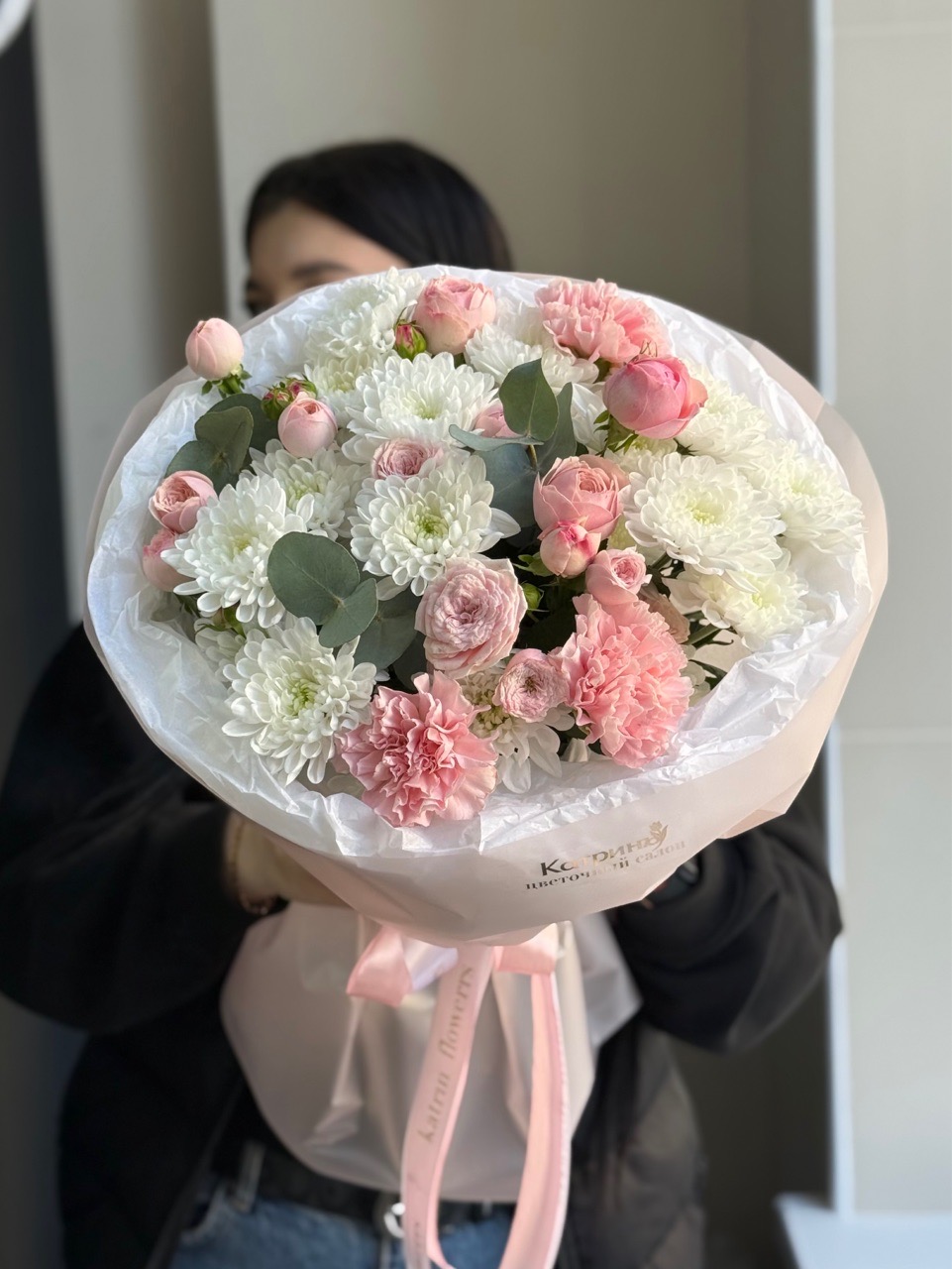 В составе: хризантемы, розы, диантусы, эвкалипт. Композиция получается объемной, воздушной и очень гармоничной.